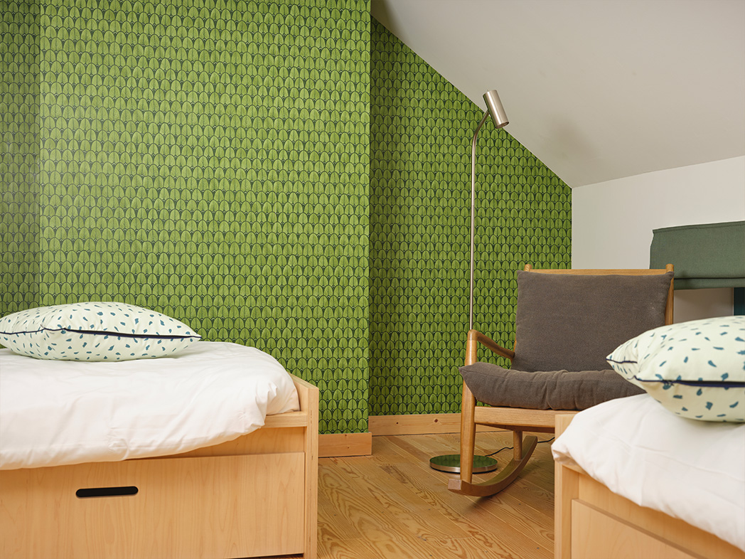 Apaisant et confortable, le gîte chez Léon arbore toutes les nuances de vert et ne laisse personne insensible au charme de sa décoration éclectique ! Un tableau en fil tendu côtoie un luminaire de designer tandis qu’un plateau de service italien répond à un calendrier-torchon estampillé « Antoinette », magazine ancien destiné à un lectorat féminin.